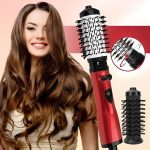 Este moldeador y secador con cepillo de aire caliente viene con dos cepillos giratorios intercambiables.
