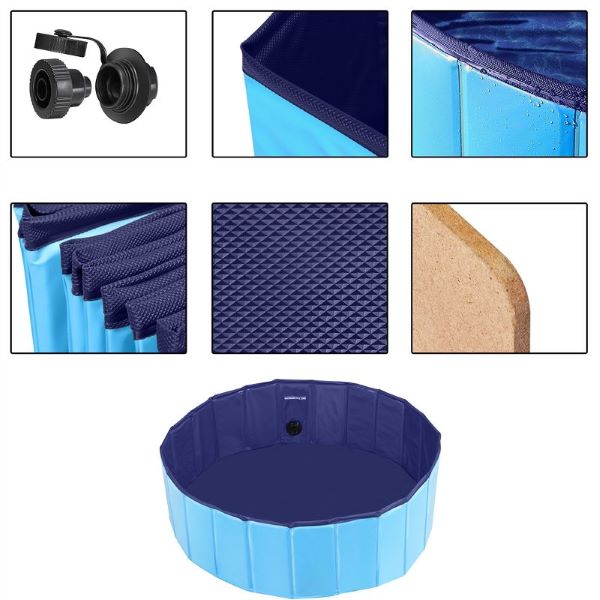 Esta piscina para perros está fabricada con PVC y lleva incorporado un tablero de plástico duro PP de 0,6 mm de grosor y alta resistencia, que es mucho más robusto que el tablero de fibra normal. Esta construcción garantiza que la piscina mantenga su forma incluso cuando está vacía. El tablero de PP es resistente al moho, lo que garantiza una larga durabilidad. El fondo grueso y antideslizante proporciona una excelente estabilidad, evitando que la piscina se hunda y garantizando una experiencia segura y agradable para sus mascotas.