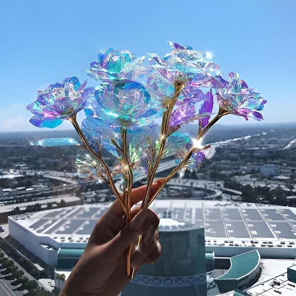 Cada rosa está elaborada con un recubrimiento iridiscente y holográfico que brilla hermosamente a la luz, creando un destello galáctico simplemente hipnotizante.
